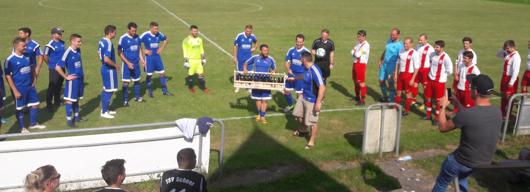 Bevor die Mannschaften vom Unparteiischen der Begegnung Ralf Hübner auf das Feld geführt wurden, verabschiedete der spielende Abteilungsleiter Florian Gerhardt einen seiner langjährigen Mitspieler und guten Geist des Teams Fabio Hupfauf. Fabio war im Jahr 2009 zum TSV Scheer gestoßen und hat seither rd. 200 Pflichtspiele für Blau-Weiß absolviert. Sein Trainingsfleiß brachte ihm sage und schreibe 470 Trainingsbesuche ein, in Kilometer umgerechnet fuhr Fabio Hupfauf dafür 20.944 Kilometer. Als Präsent wurde „Hupfe“ ein Tragerl mit 11 Freunden übergeben. Fabio muss verletzungsbedingt die Kickschuhe an den berüchtigten Nagel hängen, für seinen eigenen Abschied gegen Ende des letzten Spieles des TSV Scheer werden die Hupfe´schen Kickstiefel aber nochmals angelegt.
