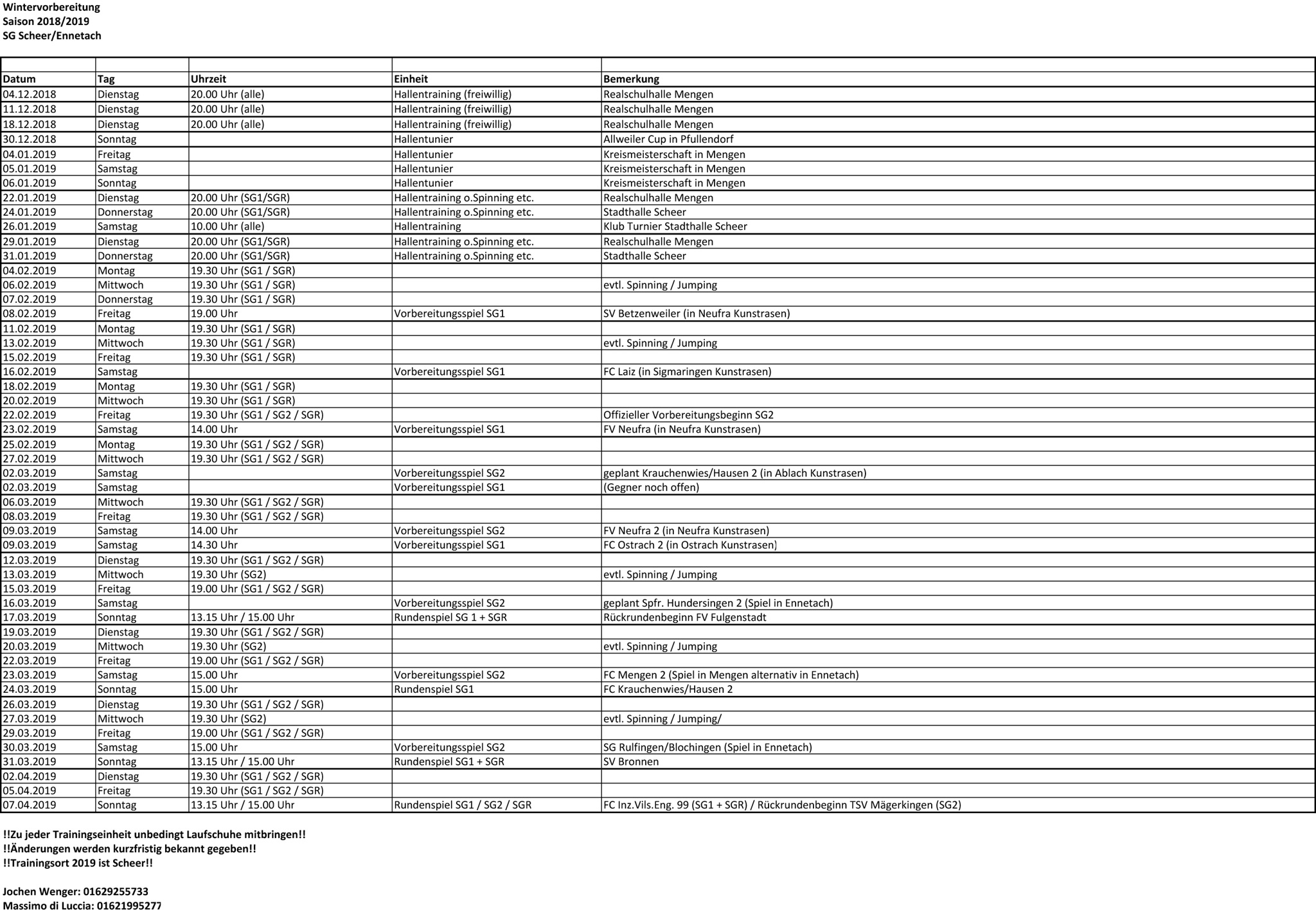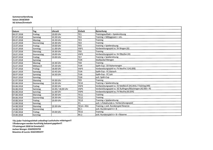 Bereits diesen Freitag, 06.07.2018 wird seitens der neu geschaffenen Spielgemeinschaft Scheer/Ennetach die neue Saison angegangen. Das Trainerteam Jochen Wenger und Massimo di Luccia hat auf 19:00 Uhr das erste gemeinsame Training der Teams mit anschließender Spielersitzung angesetzt. Trainiert wird im Jahr 2018 in Ennetach. Der Vorbereitungsplan ist üppig, neben dem Auftritt beim Stadtpokal in Mengen ist natürlich auch der Späh-Cup eingeplant, bevor es dann am 16.08.2018 wieder um Punkte gehen wird.