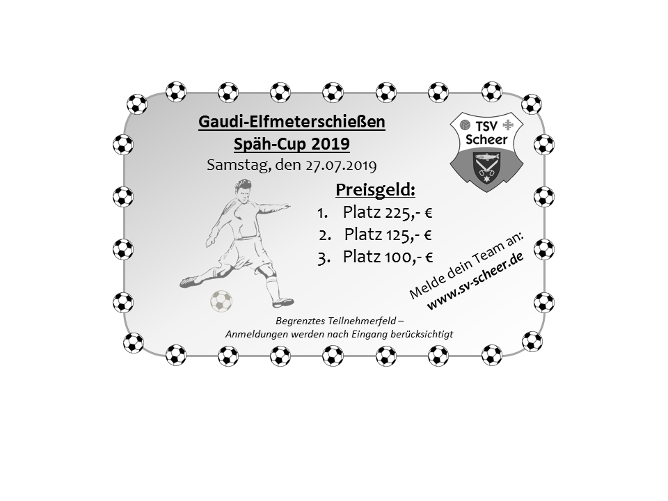 Auch in diesem Jahr richtet der TSV Scheer wieder das alljährliche Gaudi-Jubiläums-Elfmeterschießen im Rahmen des 20. Späh-Cups aus.