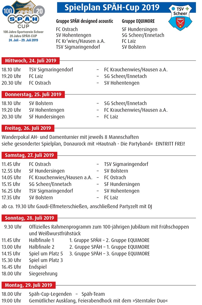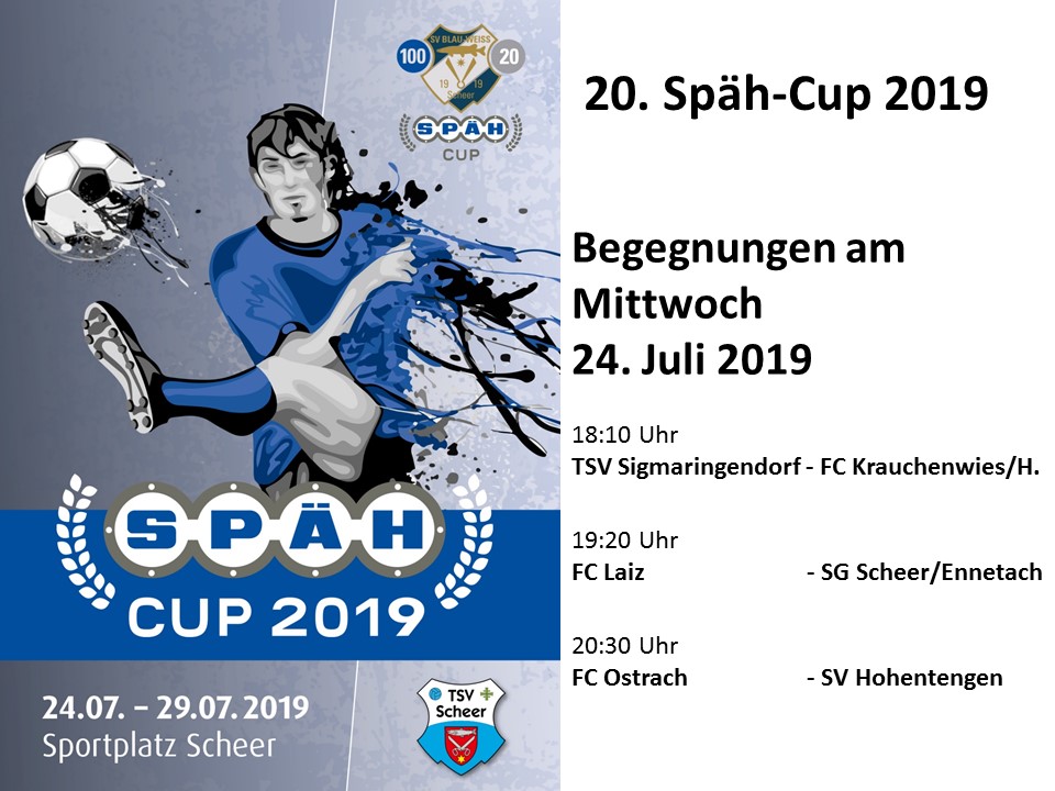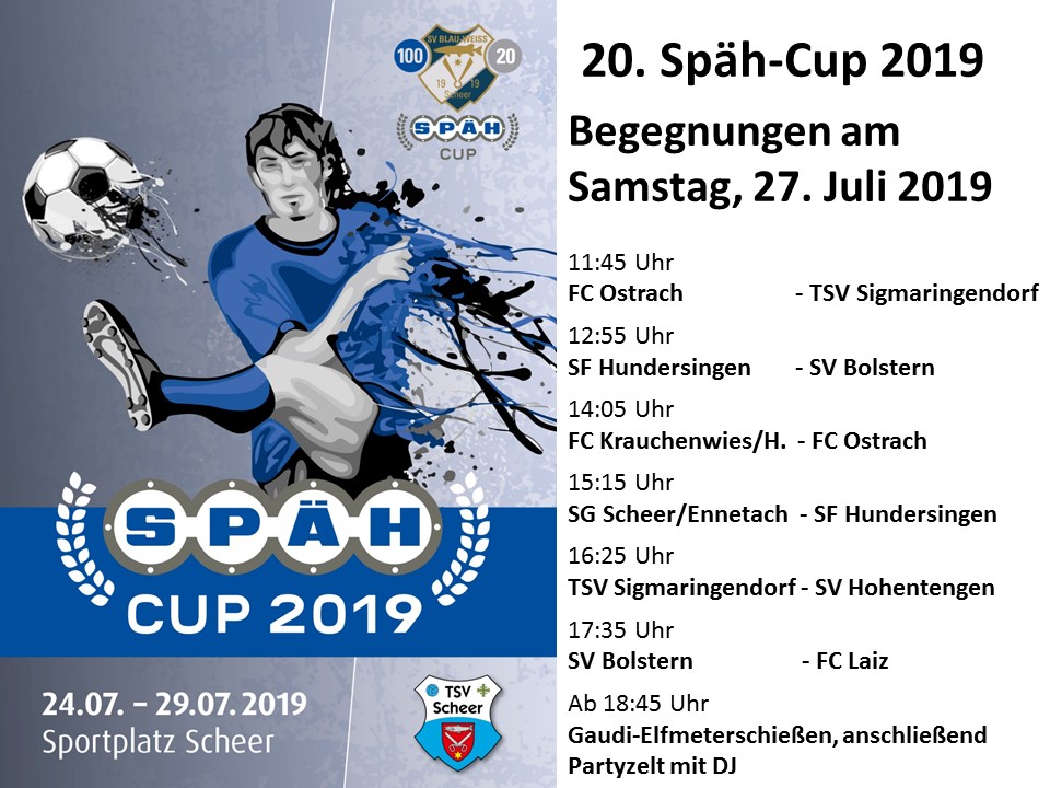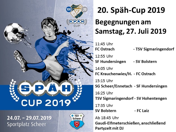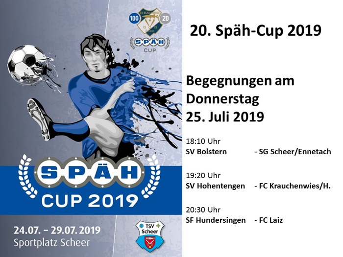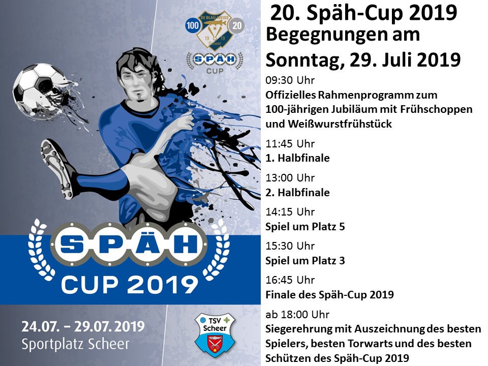 Wie jedes Jahr, fanden spannende Fußballduelle statt, welche bei den Zuschauern wieder viel Zuspruch gefunden und das Interesse geweckt haben. Die neu gegründete Spielgemeinschaft Scheer/Ennetach konnte sogar im Jubiläumsjahr dreifach feiern. Nicht nur 100 Jahre blau-weiss und 20 Jahre Späh-Cup standen im Raum, sondern am Sonntag gegen 18:00 Uhr am frühen Abend stand fest, dass der Pot nach 16 langen Jahren (2003 letzter Pot) in den Händen der SG bleibt. Die Mannschaft zeigte nach dem ersten Jahr Stärke und konnte sich formen, finden und gewann letztendlich fast alle Spiele bzw. ging ohne Niederlage von dem heimischen Rasen in der Späh-Arena.
