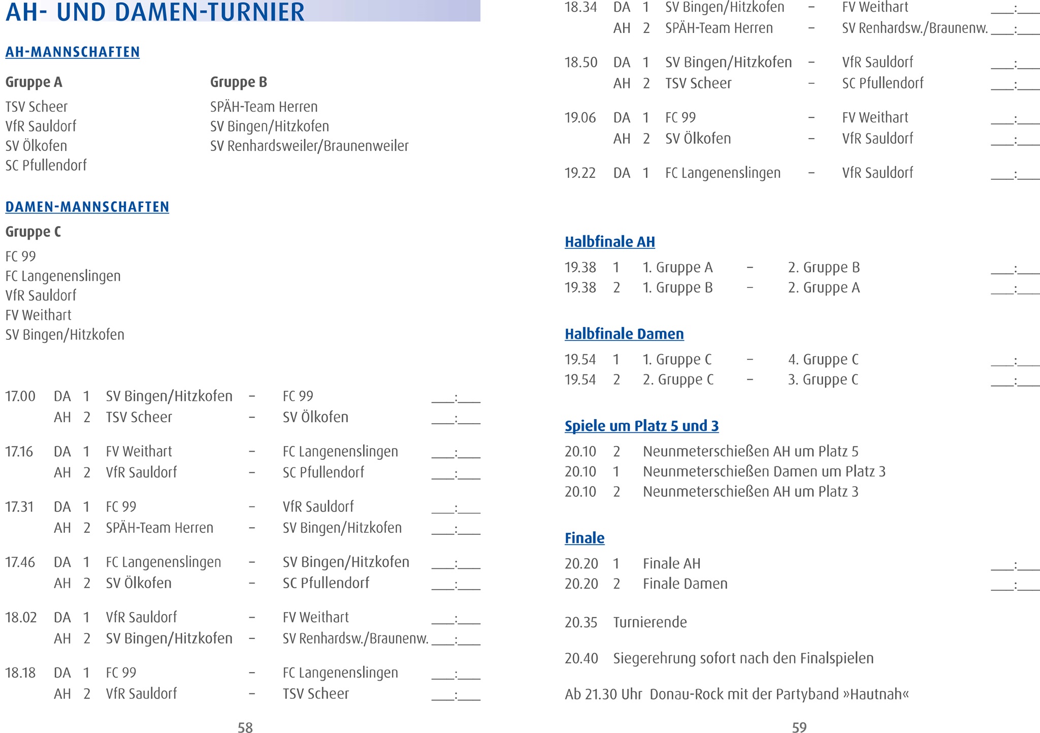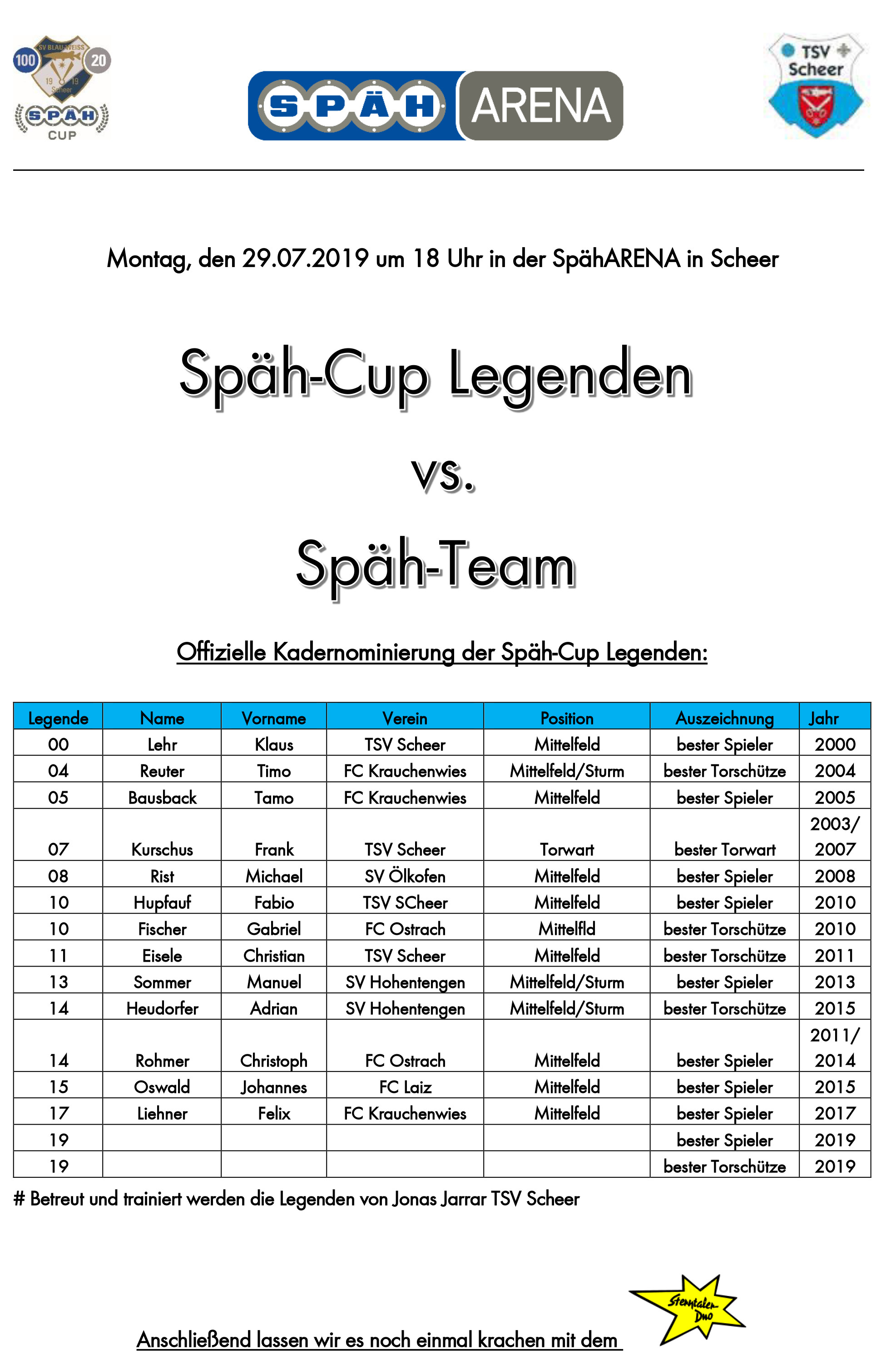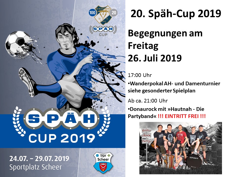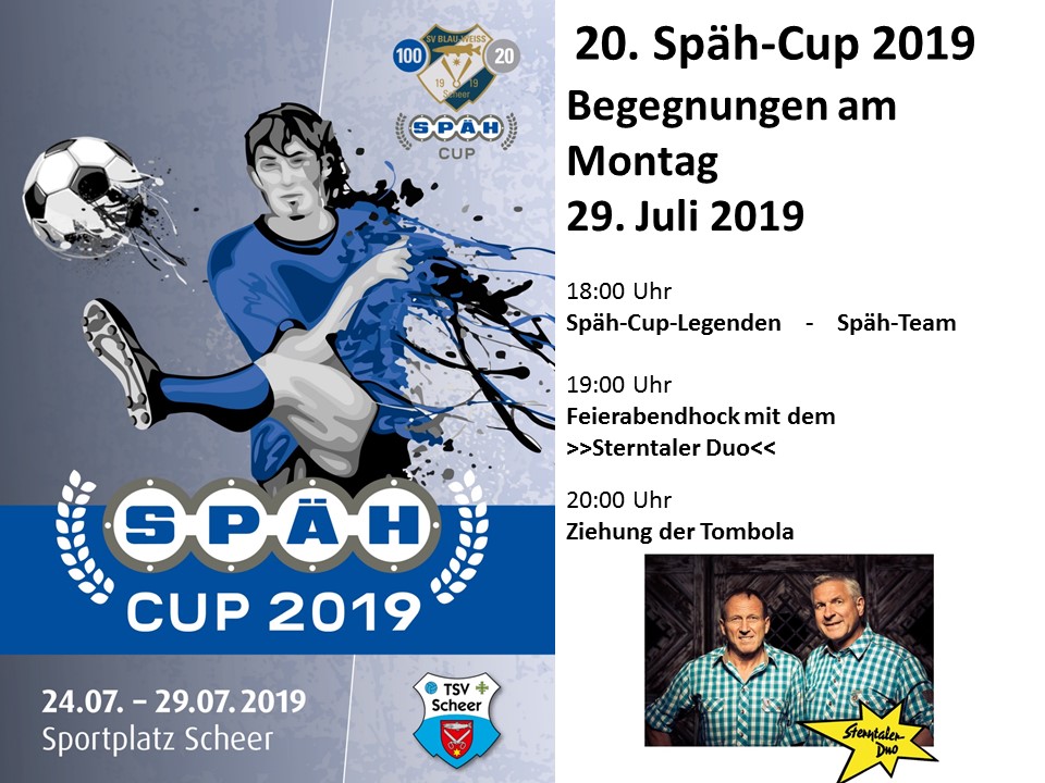 Wie jedes Jahr, fanden spannende Fußballduelle statt, welche bei den Zuschauern wieder viel Zuspruch gefunden und das Interesse geweckt haben. Die neu gegründete Spielgemeinschaft Scheer/Ennetach konnte sogar im Jubiläumsjahr dreifach feiern. Nicht nur 100 Jahre blau-weiss und 20 Jahre Späh-Cup standen im Raum, sondern am Sonntag gegen 18:00 Uhr am frühen Abend stand fest, dass der Pot nach 16 langen Jahren (2003 letzter Pot) in den Händen der SG bleibt. Die Mannschaft zeigte nach dem ersten Jahr Stärke und konnte sich formen, finden und gewann letztendlich fast alle Spiele bzw. ging ohne Niederlage von dem heimischen Rasen in der Späh-Arena.