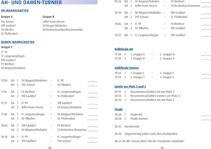 Der Gastgeber kann ein Jahr nach Gründung der Spielgemeinschaft auf eine erfolgreiche Saison zurückblicken, die mit dem dritten Tabellenplatz abgeschlossen wurde. Bis zwei Spieltage vor Schluss hatte man noch an dem Relegationsplatz gerochen. Doch mit der Ausbeute von 0 Punkten gegen die direkten Konkurrenten stehen zwei Mannschaften zurecht vor der SG. Eine gute Grundlage und Mischung ist jedoch gefunden. Jetzt liegt es auch an der Mannschaft selbst ihr Können unter Beweis zu stellen und den eigenen Ansprüchen gerecht zu werden. Coach Wenger und die beiden Vereine um die Spielleiter Kurschus/Czarkowski werden auf jeden Fall die besten Voraussetzungen dafür bieten. Wie immer wird es das Ziel sein, am Späh-Cup-Sonntag nochmals auflaufen zu dürfen. Vor allem beim Jubiläumsturnier und dem 100-jährigen Geburtstag von Blau-Weiß Scheer will man sich von der besten Seite zeigen.