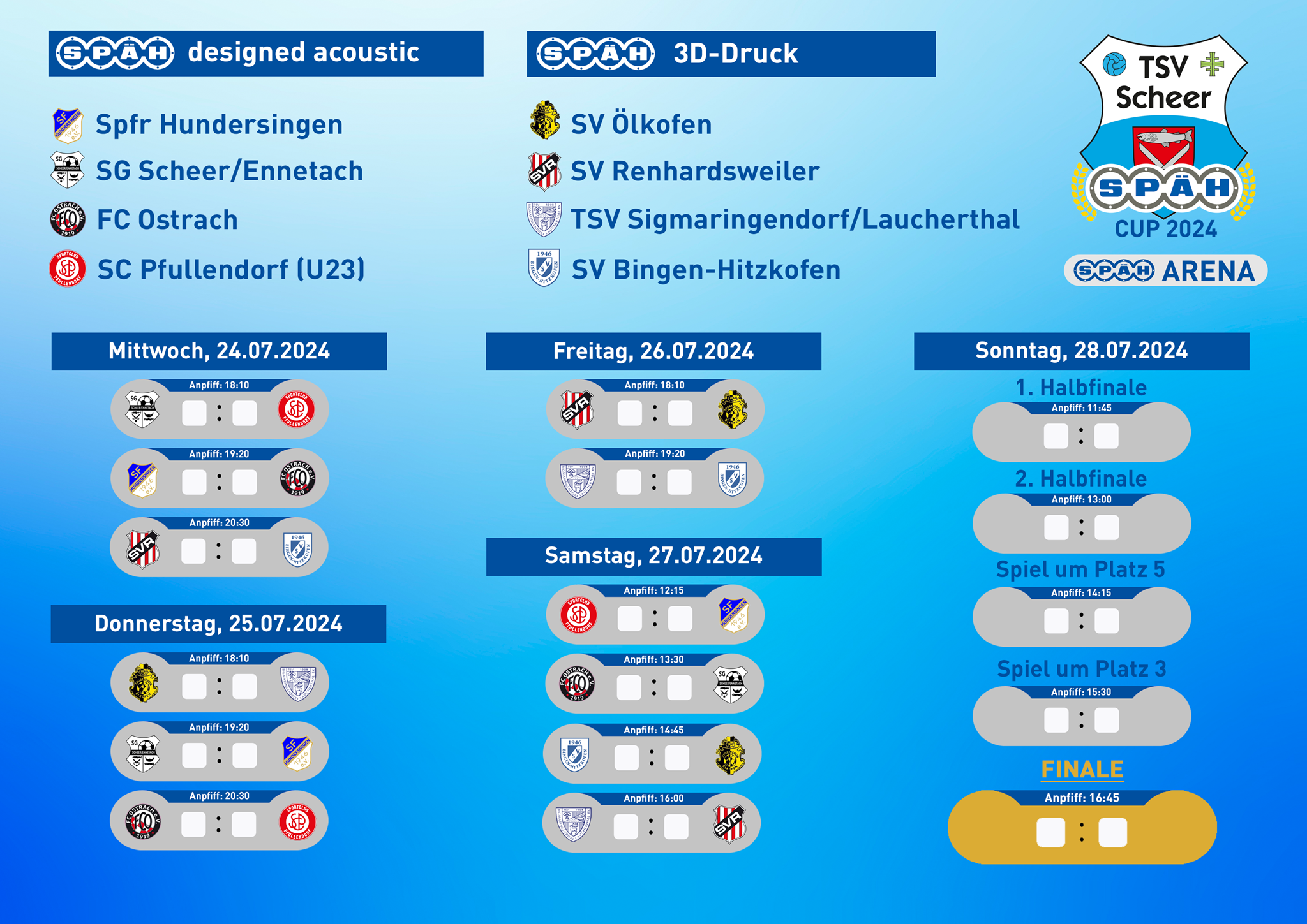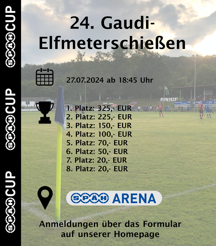 In den Tagen 24.07.2024 bis 28.07.2024 findet der 24. Späh-Cup statt. Der TSV Scheer richtet zudem wieder das legendäre Gaudi- Elfmeterschießen aus.Das diesjährige Gaudi-Elfmeterschießen findet am Samstag, den 27.07.2024 ab ca. 18:45 Uhr in der SPÄH-Arena statt. Hierzu möchten wir Euch wieder recht herzlich einladen!