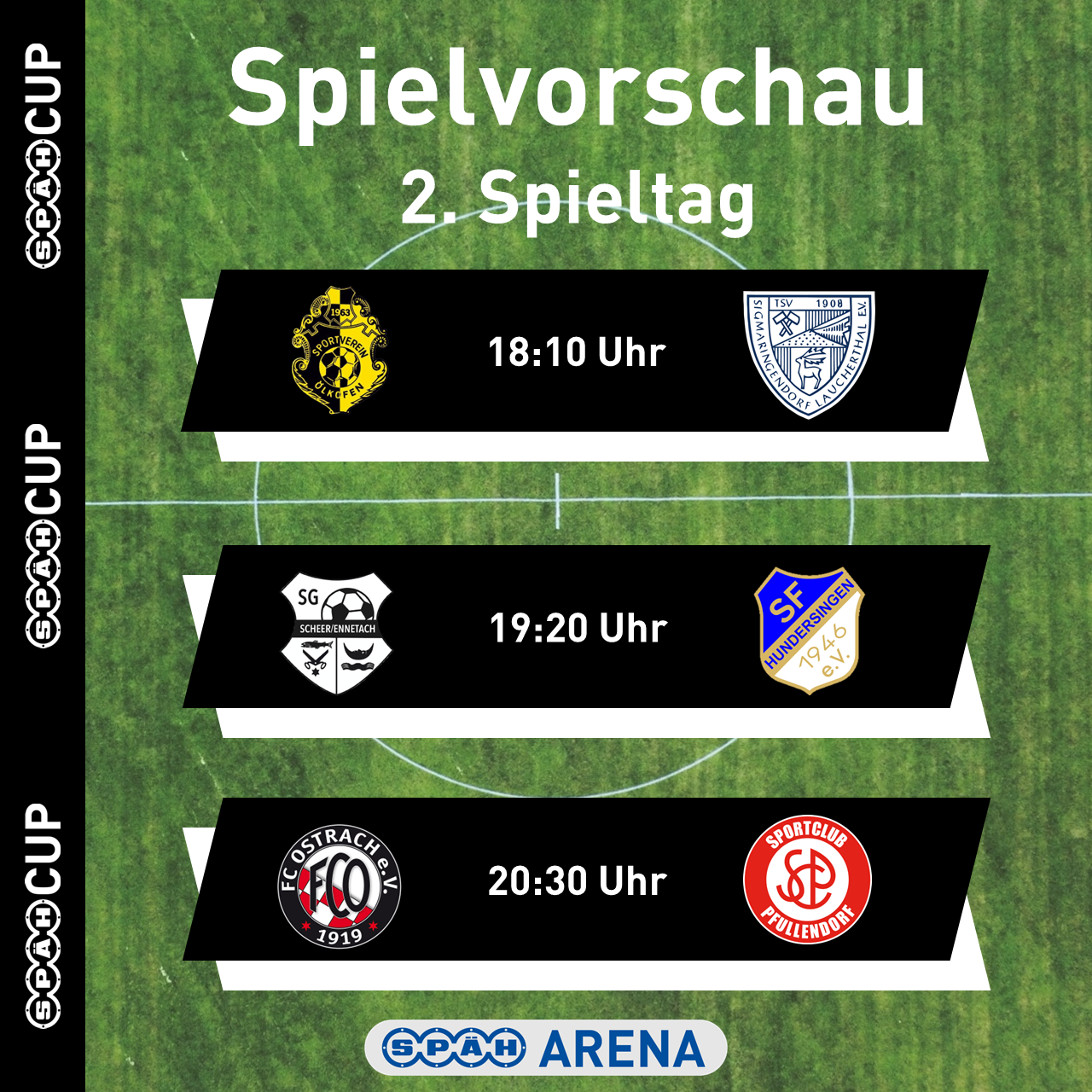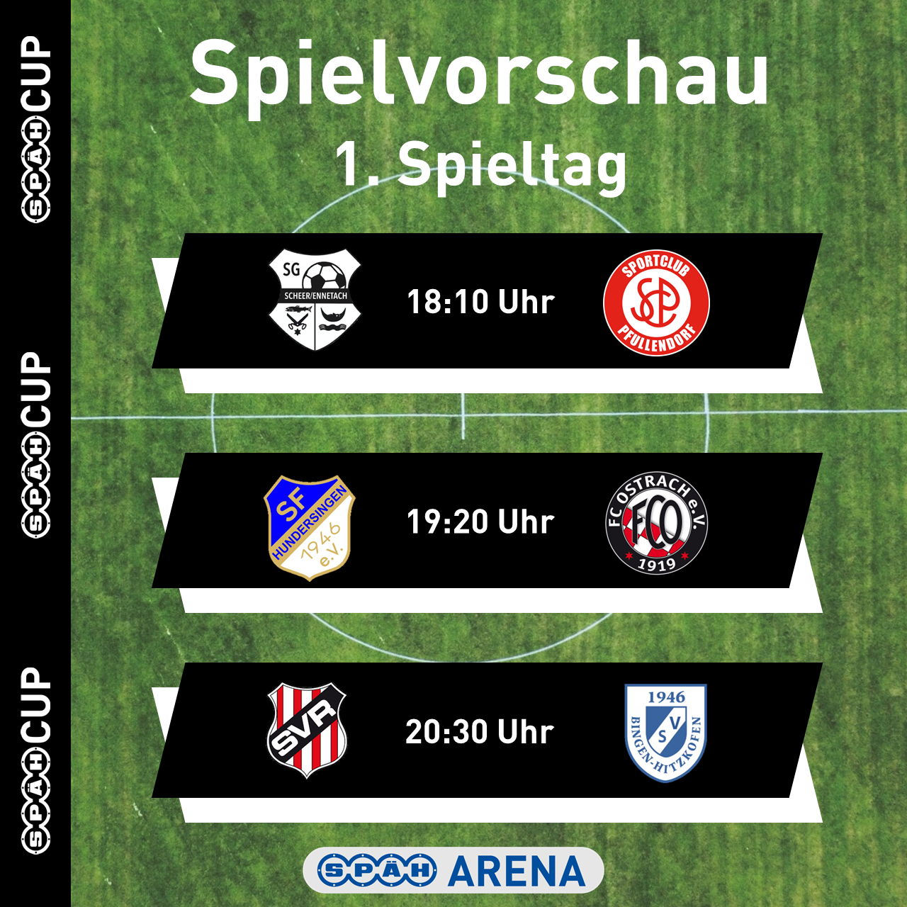 Am Mittwoch Abend bestreitet die U23 des SC Pfullendorf das Auftaktspiel gegen den Gastgeber aus Scheer und Ennetach, gefolgt von den Spfr Hundersingen gegen den FC Ostrach und dem SV Renhardsweiler gegen den SV Bingen-Hitzkofen.
